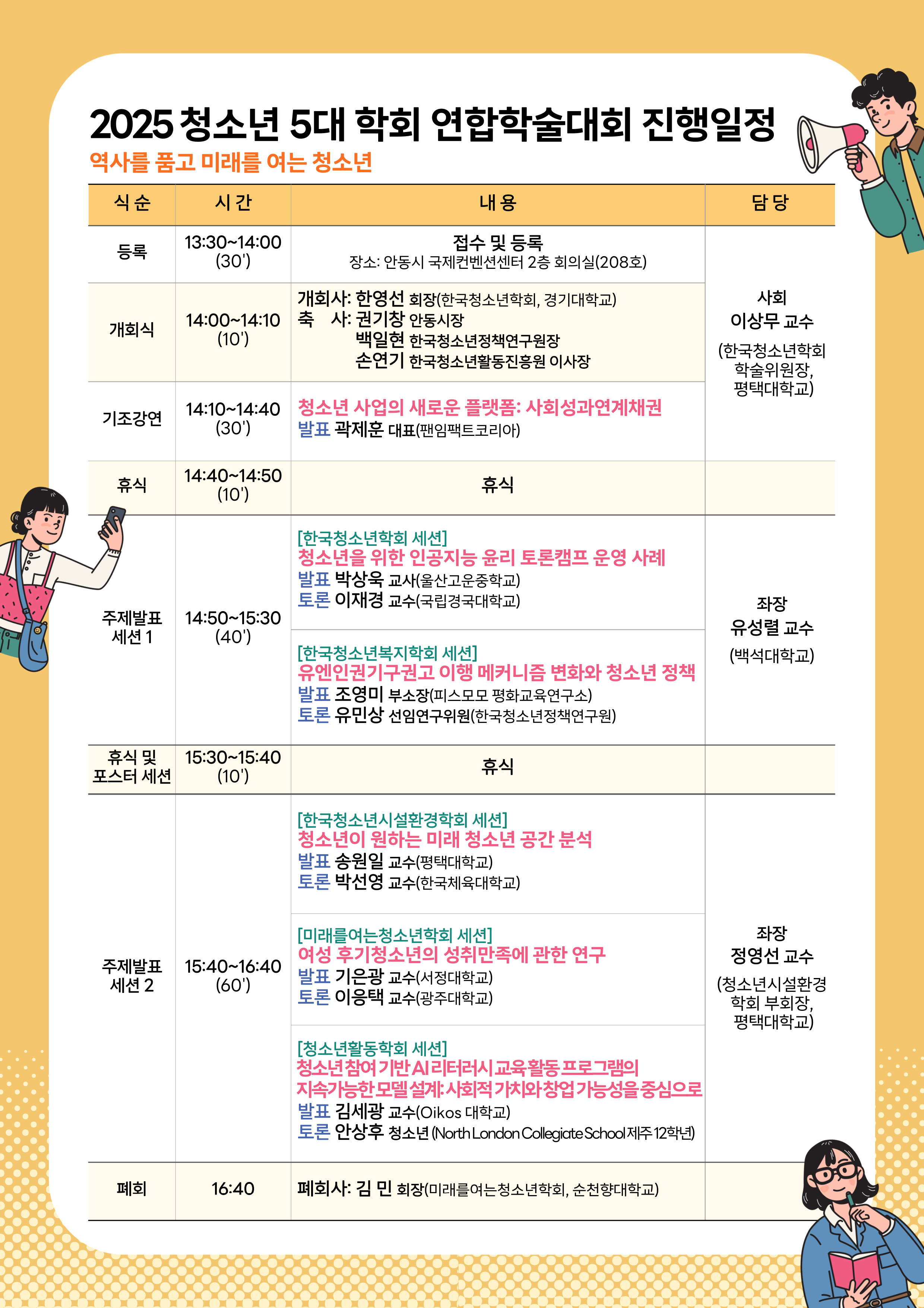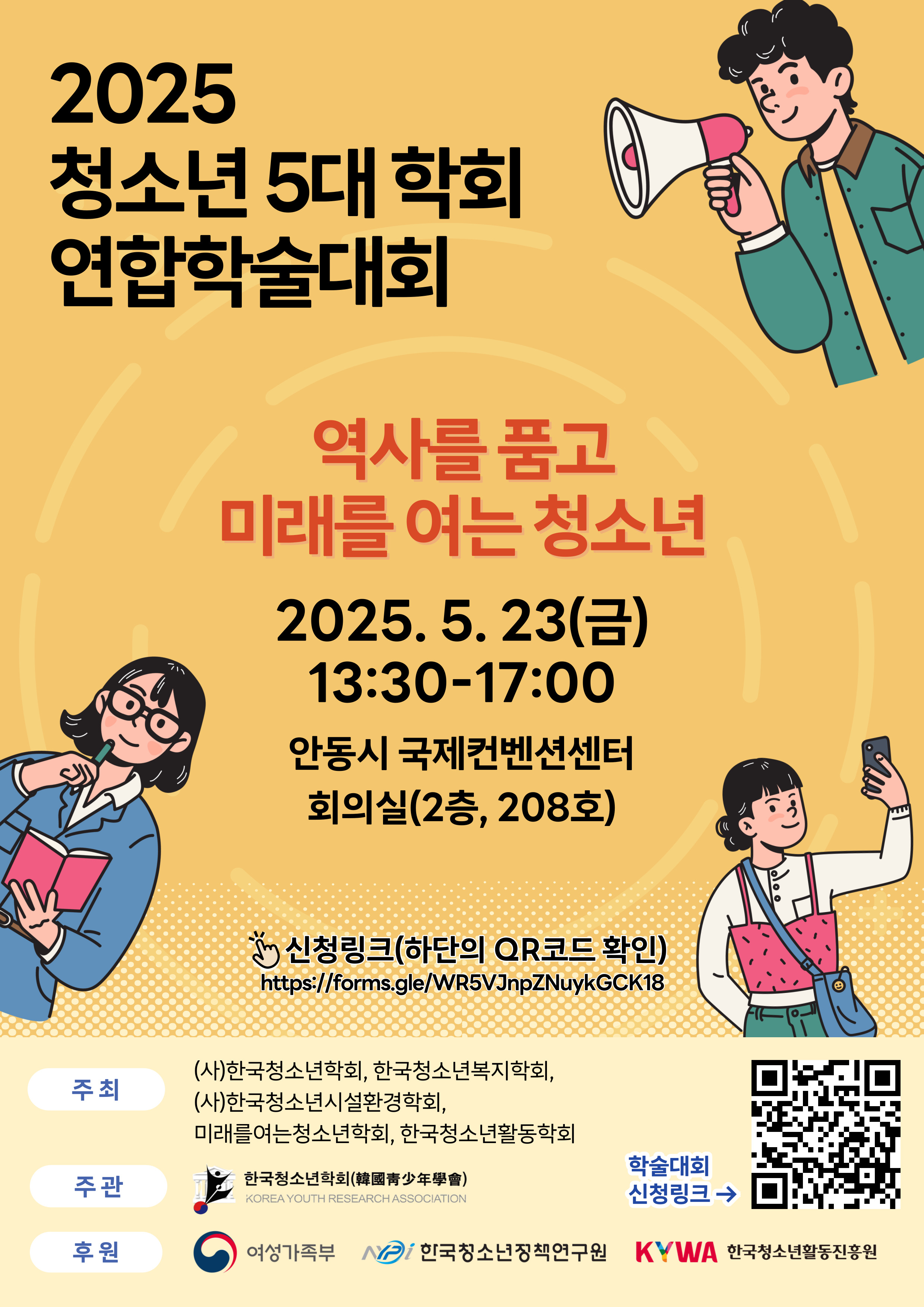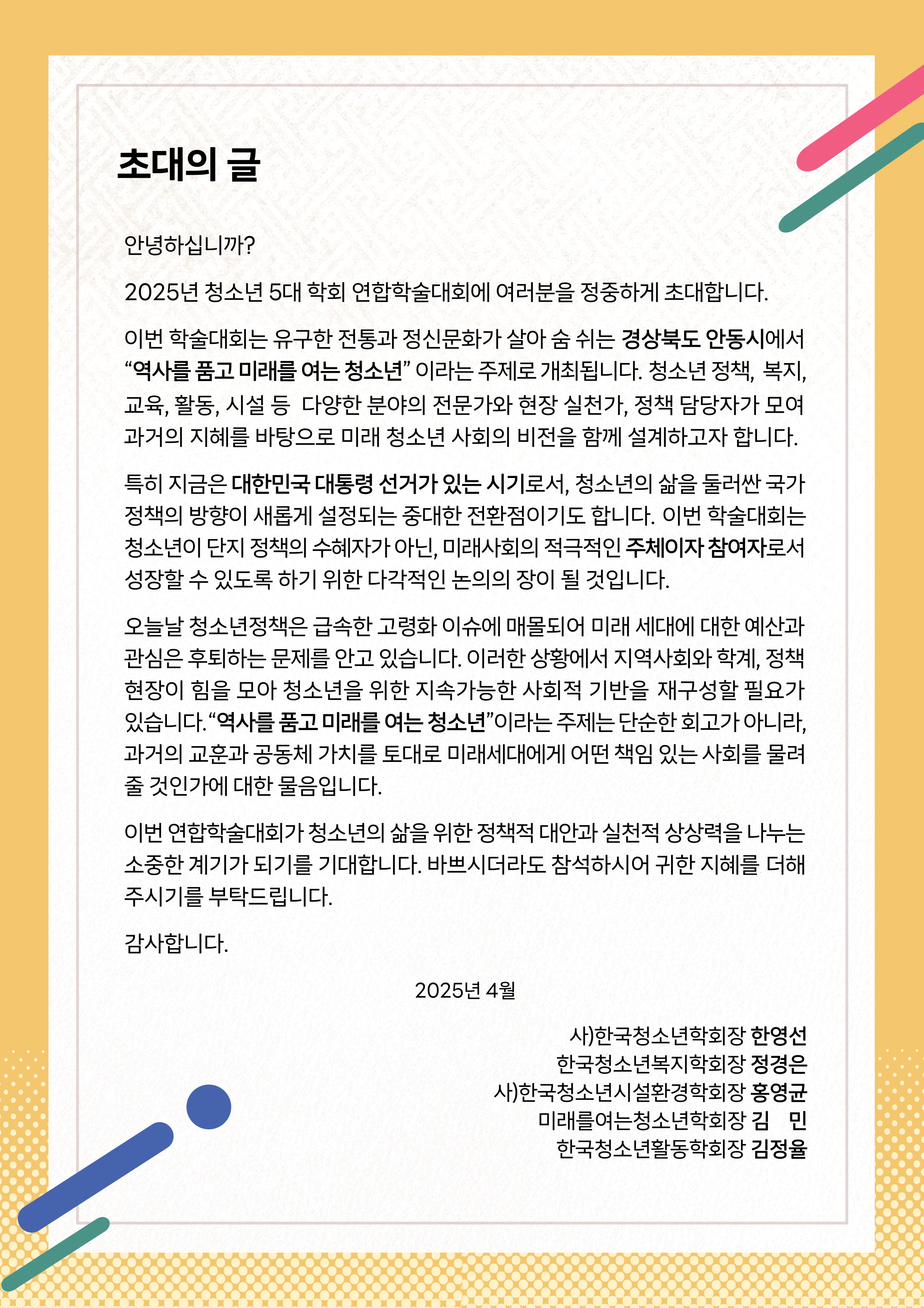 2025년 5월 23일 금요일, '역사를 품고 미래를 여는 청소년' 주제 하에 청소년 공동연합학술대회가 개최되었습니다. 본 학술대회는 한국청소년학회가 주관하여 개최한 연합학술대회로, 안동시 국제컨벤션센터 회의실에서 진행되었습니다. '청소년 사업의 새로운 플랫폼: 사회성과연계채권' 기조강연을 시작으로, 열띤 논의가 이루어졌습니다. 참석해주신 모든분들께 진심으로 감사드립니다.